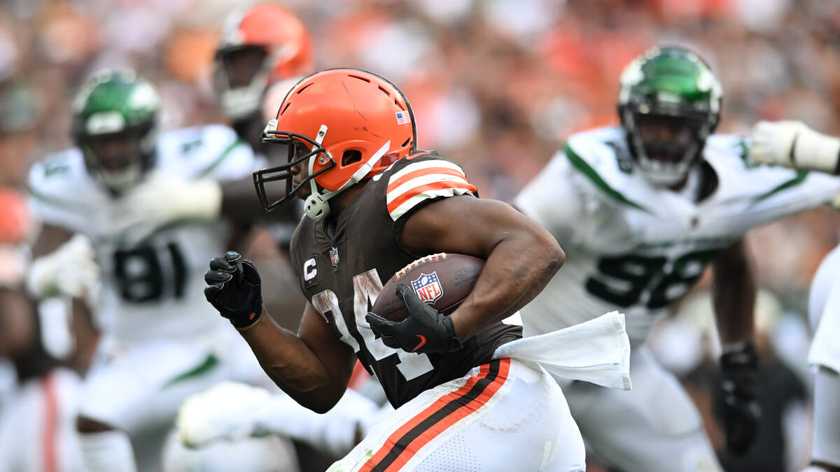 CLEVELAND, OHIO - SEPTEMBER 18: Nick Chubb #24 of the Cleveland Browns runs with the ball against the New York Jets during the second half at FirstEnergy Stadium on September 18, 2022 in Cleveland, Ohio. (Photo by Nick Cammett/Getty Images)