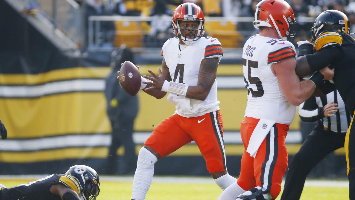 PITTSBURGH, PENNSYLVANIA - JANUARY 08: Deshaun Watson #4 of the Cleveland Browns looks to pass the ball during the first half of the game against the Pittsburgh Steelers at Acrisure Stadium on January 08, 2023 in Pittsburgh, Pennsylvania.