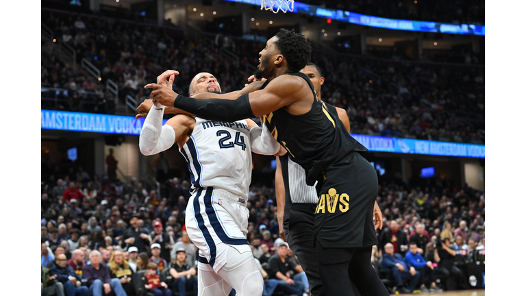 Dillon Brooks #24 of the Memphis Grizzlies fights with Donovan Mitchell #45 of the Cleveland Cavaliers during the third quarter at Rocket Mortgage Fieldhouse on February 02, 2023 in Cleveland, Ohio. Both players were ejected.