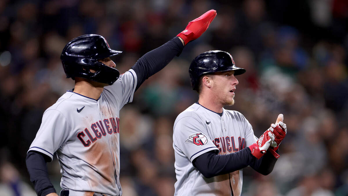 SEATTLE, WASHINGTON - MARCH 31: Andres Gimenez #0 and Myles Straw #7 of the Cleveland Guardians score during the fourth inning against the Seattle Mariners at T-Mobile Park on March 31, 2023 in Seattle, Washington. (Photo by Steph Chambers/Getty Images)