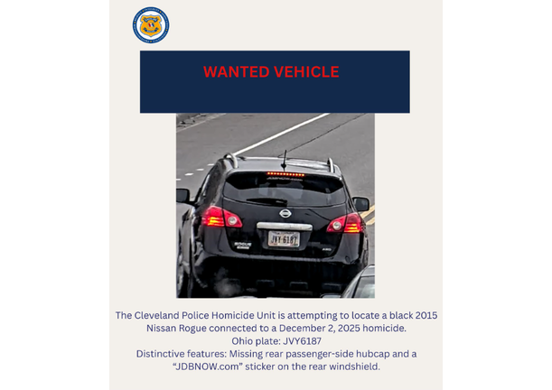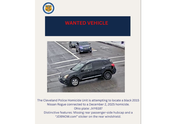 (Cleveland) - Cleveland Police Homicide Unit is seeking the public’s assistance in locating a vehicle connected to a homicide that occurred on December 2, 2025, at approximately 11:30 p.m. in the area of East 106th Street and Superior Avenue.