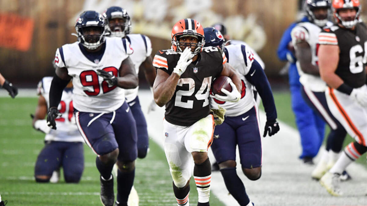 CLEVELAND, OHIO - NOVEMBER 15: Nick Chubb #24 of the Cleveland Browns runs the ball for 59 yards against the Houston Texans during the second half at FirstEnergy Stadium on November 15, 2020 in Cleveland, Ohio. (Photo by Jamie Sabau/Getty Images)