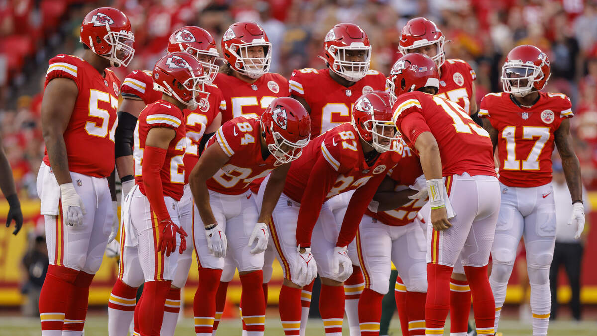 In a tribute to the late Kansas City Chiefs quarterback Len Dawson, who died this week at the age of 87, Patrick Mahomes #15 of the Kansas City Chiefs led the team in a choir formation huddle on the first Kansas City offensive play on the preseason game against the Green Bay Packers at Arrowhead Stadium on August 25, 2022 in Kansas City, Missouri.