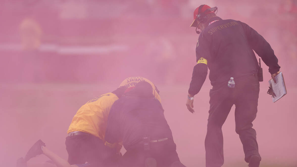 The protestor was then taken away by security staff. "That's not making a play," Wagner said. "That's just keeping it safe. You don't know what that fan got or what they're doing. You see it all the time and we don't know what they're carrying in their pockets. It's whatever that little smoke stuff is, but that s--- could be dangerous. "One of the guys on the other side, it looked like he got hurt and security looked like he was struggling, so I was frustrated, so I took it out on him." The collision left a noticeable mark on the field near the 40-yard line. "I saw Bobby Wagner take somebody out," 49ers coach Kyle Shanahan said. "That was kind of cool to see." A fan also ran onto the field with a device letting out pink smoke earlier in Monday night's game but was stopped by security.