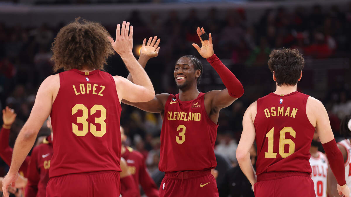 CHICAGO, ILLINOIS - DECEMBER 31: Caris LeVert #3 of the Cleveland Cavaliers celebrates with Robin Lopez #33 and Cedi Osman #16 against the Chicago Bulls during the first half at United Center on December 31, 2022 in Chicago, Illinois.Photo: Michael Reaves/Getty Images