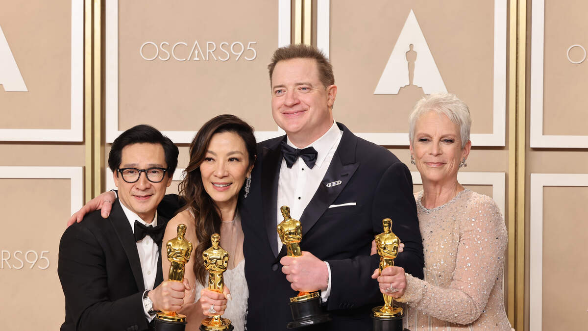 The 95th Academy Awards ceremony, hosted by Jimmy Kimmel, was held Sunday night at the Dolby Theatre at Ovation Hollywood. Everything Everywhere All at Once was the big winner, winning seven Oscars out of its leading 11 nominations, including Best Picture. Star Michelle Yeoh won best actress -- the first Asian performer so honored -- while Brendan Fraser won Best Actor for his starring role in The Whale.