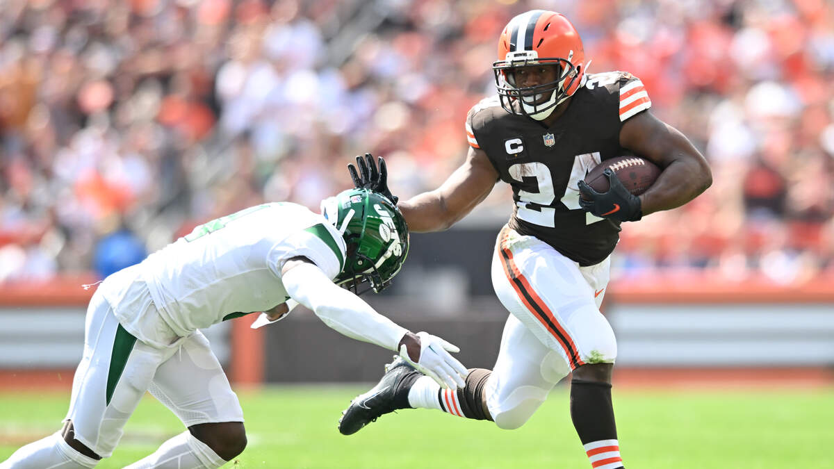 CLEVELAND, OHIO - SEPTEMBER 18: Nick Chubb #24 of the Cleveland Browns runs with the ball before being tackled by D.J. Reed #4 of the New York Jets during the first quarter at FirstEnergy Stadium on September 18, 2022 in Cleveland, Ohio.Photo: Nick Cammett/Getty Images