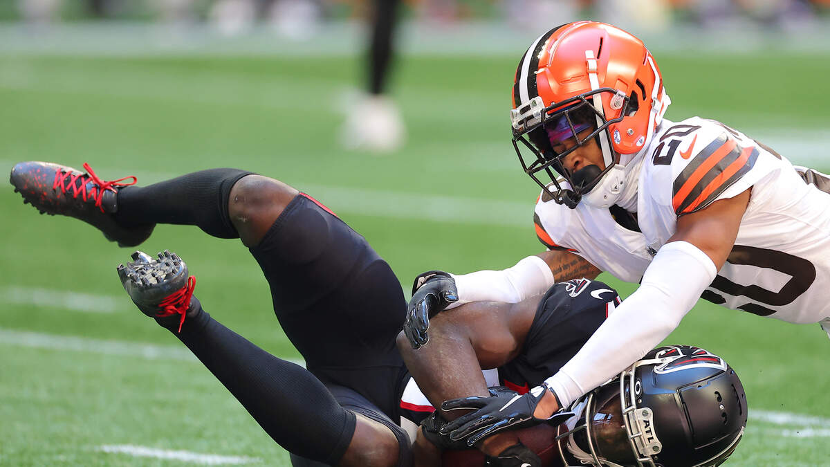 ATLANTA, GEORGIA - OCTOBER 02: Olamide Zaccheaus #17 of the Atlanta Falcons makes a reception against Greg Newsome II #20 of the Cleveland Browns during the first quarter at Mercedes-Benz Stadium on October 02, 2022 in Atlanta, Georgia.Photo: Kevin C. Cox/Getty Images