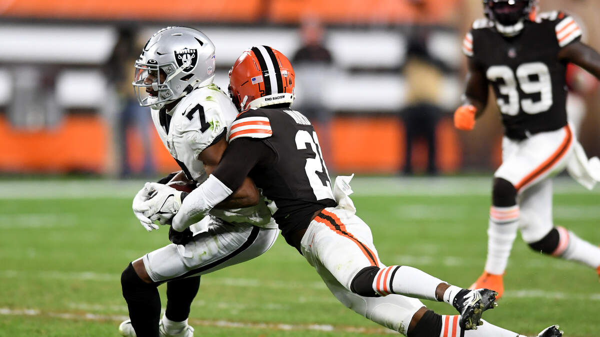 CLEVELAND, OHIO - DECEMBER 20: Zay Jones #7 of the Las Vegas Raiders carries the ball as he is tackled by Greg Newsome II #20 of the Cleveland Browns in the fourth quarter of the game at FirstEnergy Stadium on December 20, 2021 in Cleveland, Ohio.Photo: Nick Cammett/Getty Images