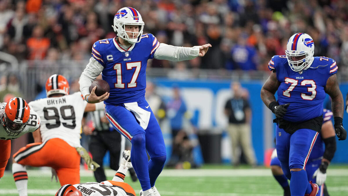 DETROIT, MICHIGAN - NOVEMBER 20: Josh Allen #17 of the Buffalo Bills runs past Deion Jones #54 of the Cleveland Browns during the third quarter at Ford Field on November 20, 2022 in Detroit, Michigan. (Photo by Nic Antaya/Getty Images)Photo: Getty Images/Nic Antaya