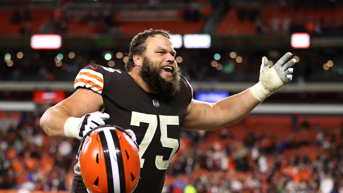 CLEVELAND, OHIO - OCTOBER 21: Guard Joel Bitonio #75 of the Cleveland Browns celebrates after the Browns defeated the Denver Broncos at FirstEnergy Stadium on October 21, 2021 in Cleveland, Ohio.Photo: Gregory Shamus/Getty Images