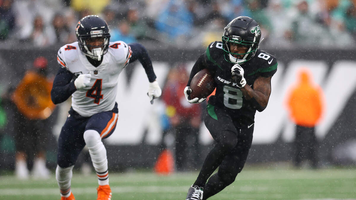 EAST RUTHERFORD, NEW JERSEY - NOVEMBER 27: Elijah Moore #8 of the New York Jets runs for yards in the first half of a game against the Chicago Bears at MetLife Stadium on November 27, 2022 in East Rutherford, New Jersey.Photo: Mike Stobe/Getty Images