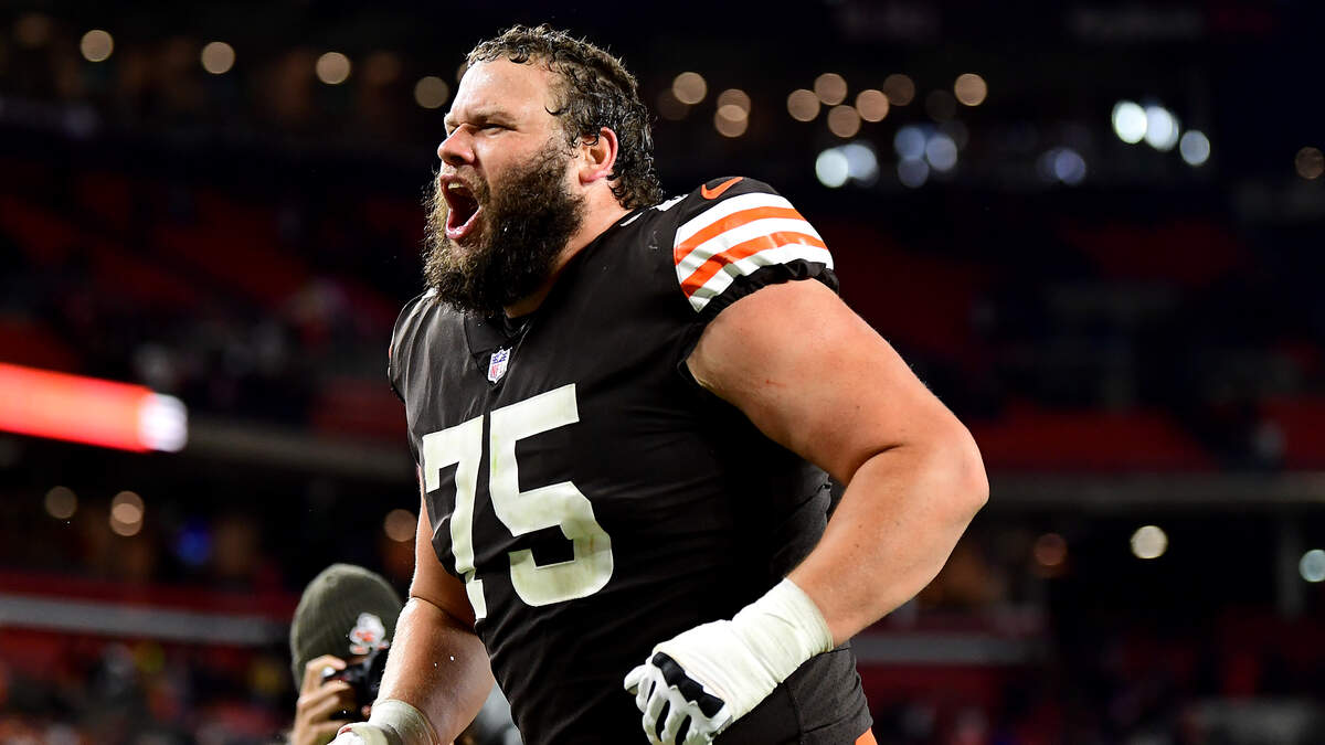 CLEVELAND, OHIO - OCTOBER 21: Guard Joel Bitonio #75 of the Cleveland Browns celebrates the Browns win over the Denver Broncos at FirstEnergy Stadium on October 21, 2021 in Cleveland, Ohio.Photo: Emilee Chinn/Getty Images