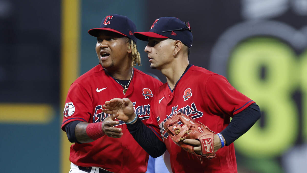 CLEVELAND, OH - MAY 30: Jose Ramirez #11 and Andres Gimenez #0 of the Cleveland Guardians celebrate a 7-3 win against the Kansas City Royals at Progressive Field on May 30, 2022 in Cleveland, Ohio. (Photo by Ron Schwane/Getty Images)Photo: (Photo by Ron Schwane/Getty Images)